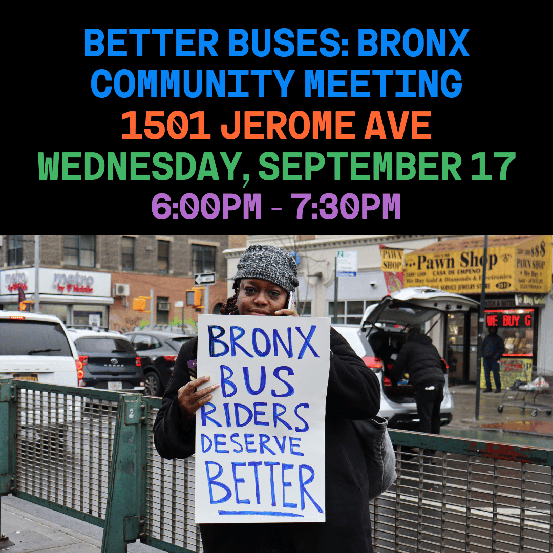 Join us on Wednesday, September 17, at New Settlement Community Center (1501 Jerome Avenue) from 6:00pm-7:30pm for our Better Buses Bronx Community Meeting, where we’ll discuss: