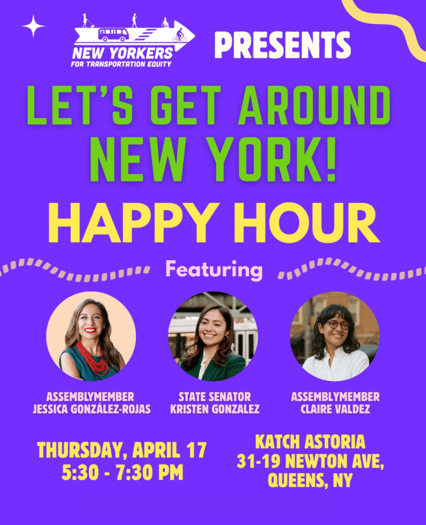 New Yorkers for Transportation Equity is hosting a Let’s Get Around NY Happy Hour on Thursday, April 17, from 5:30pm – 7:30pm with Assemblymember Jessica Gonzalez-Rojas, State Senator Kristen Gonzalez, Assemblymember Claire Valdez, and our partners at TransAlt, Tri-State Transportation Campaign, 34th Street Open Streets, and Families for Safe Streets!