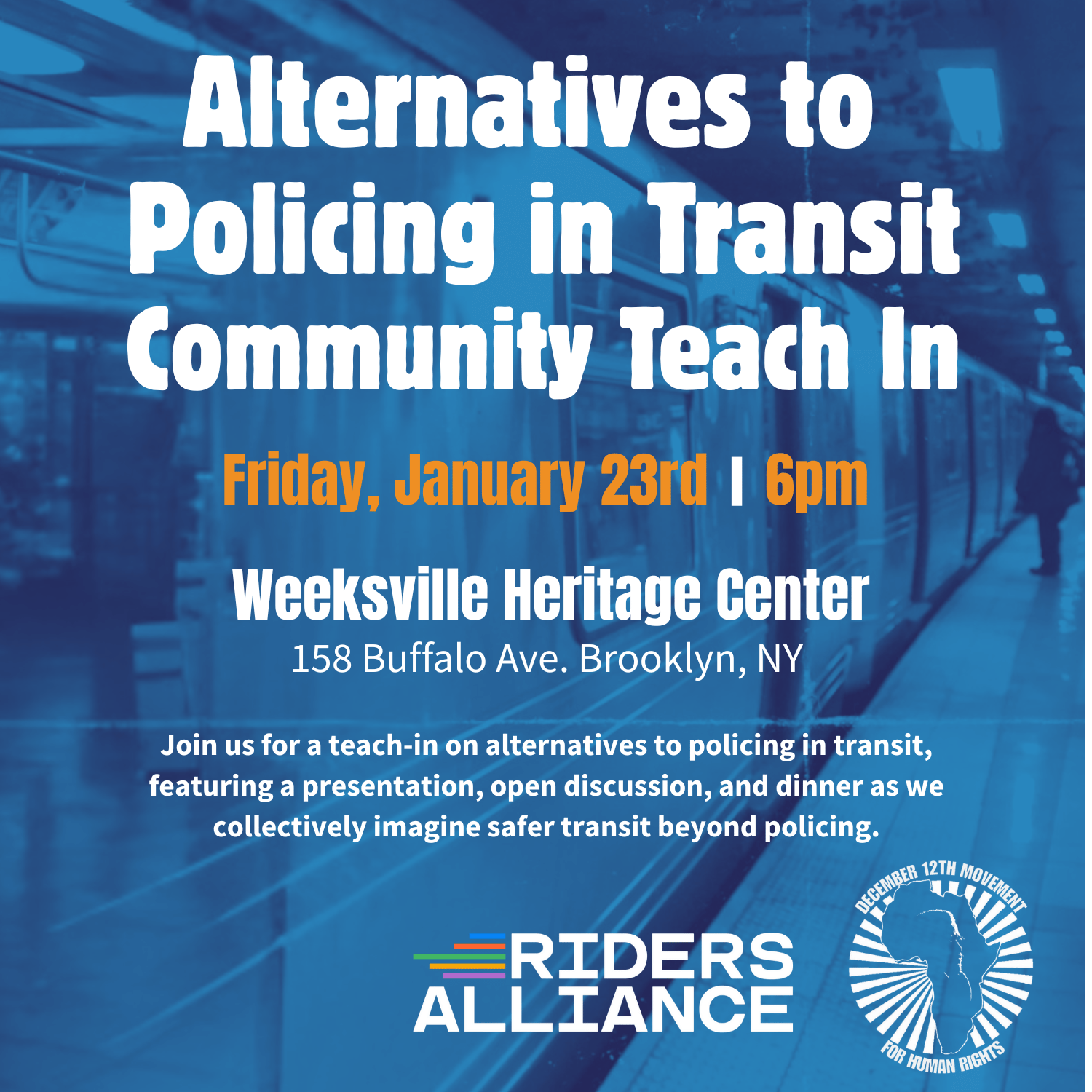Join us at the Weeksville Heritage Center, along with organizers from the December 12th Movement, to learn about the expanding role of police in public transportation — how fare enforcement, surveillance, and criminalization intersect with rising fares and a deepening affordability crisis.
